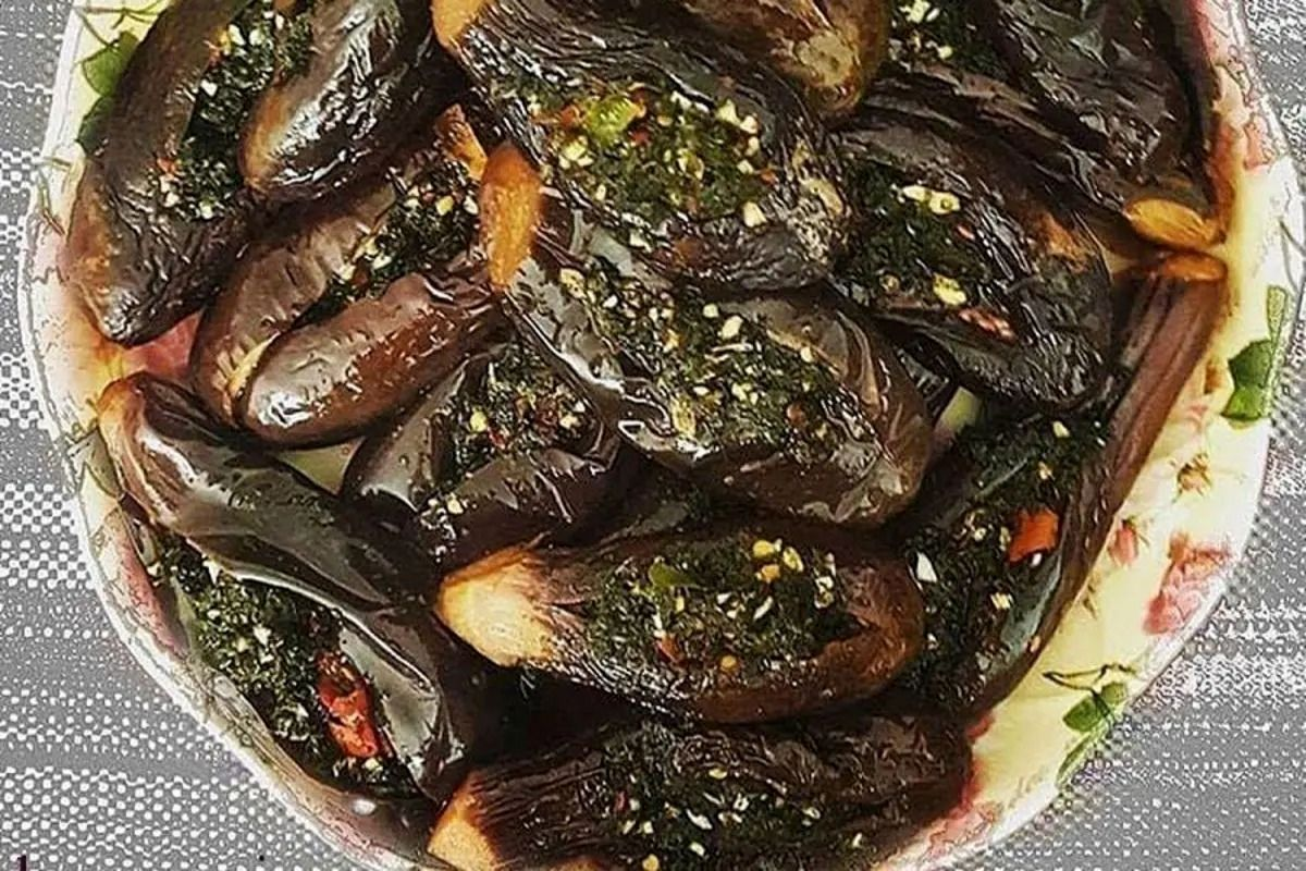 - چیدن بادمجانها در ظرف: بادمجانهای پر شده را در ظرف شیشهای تمیز بچینید و روی آنها را با سرکه بپوشانید.