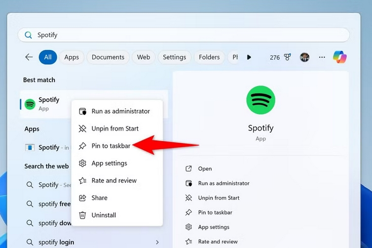 در اینجا اپلیکیشنی که می خواهید آن را پین کنید را بنویسید و بعد از این که آن را در نتایج مشاهده کردید روی آن راست کلیک کنید و گزینه Pin to Taskbar را انتخاب کنید.