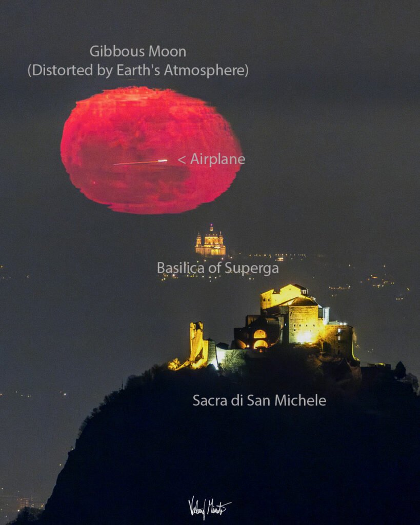 این تصویر شگفتانگیز حدود 2 هفته پیش در آسمان تورین ایتالیا ثبت شده است. تصویر ثبتشده همترازی چهارتایی بینظیری نشان میدهد: ماه، هواپیمای گذری و 2 سازه تاریخی روی زمین، صومعهسرای Sacra di San Michele و کلیسای جامع Superga، که ترکیب بصری آن را کامل کرده است.