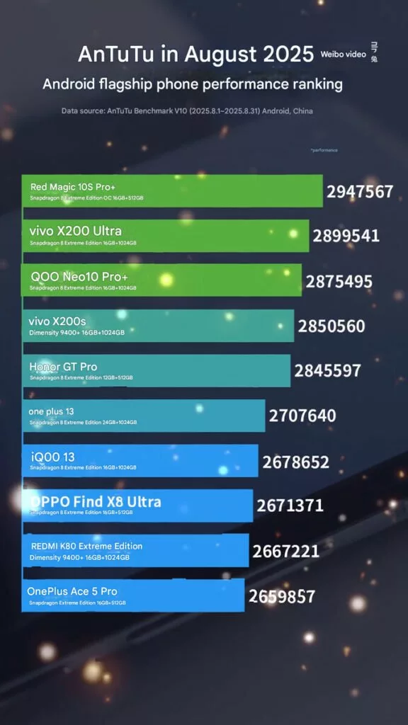 گزارش جدید آنتوتو (AnTuTu) از عملکرد گوشی‌های پرچمدار در بازار چین منتشر شد و برترین دستگاه‌های ماه آگوست ۲۰۲۵ معرفی شدند. این گزارش بار دیگر نشان داد که چیپست اسنپدراگون ۸ الیت تسلط مطلق خود را در دنیای پرچمداران حفظ کرده و تنها دو گوشی از میان ۱۰ مدل برتر، مجهز به پردازنده مدیاتک دایمنسیتی ۹۴۰۰ پلاس هستند.