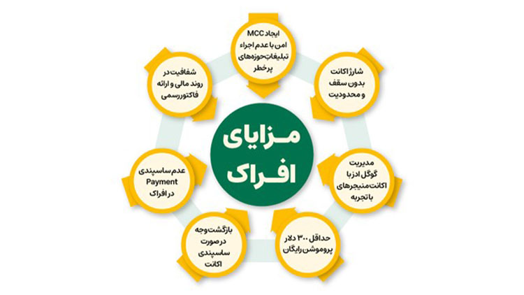 به دلیل مساله تحریم ایران، ممکن است، اکانت گوگل ادز شما ساسپند شود؛ یکی از مزیتهای افراک برای گوگل ادز این است که چنانچه اکانت گوگل ادز شما ساسپند شود، مبلغ باقیمانده در حساب، به شما عودت داده میشود.
