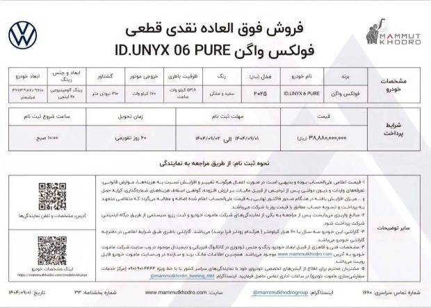 قیمت قطعی فولکس واگن ID.UNIX تیپ Pure از سوی ماموت خودرو ۳۸,۸۸۰,۰۰۰,۰۰۰ ریال اعلام شده است. موعد تحویل ۶۰ روز تقویمی با گارانتی سه سال یا ۶۰,۰۰۰ کیلومتر خواهد بود. ثبت نام در نمایندگی‌های مجاز ماموت خودرو طی روزهای شنبه ۱ و یکشنبه ۲ آذر ۱۴۰۴ انجام می‌شود.