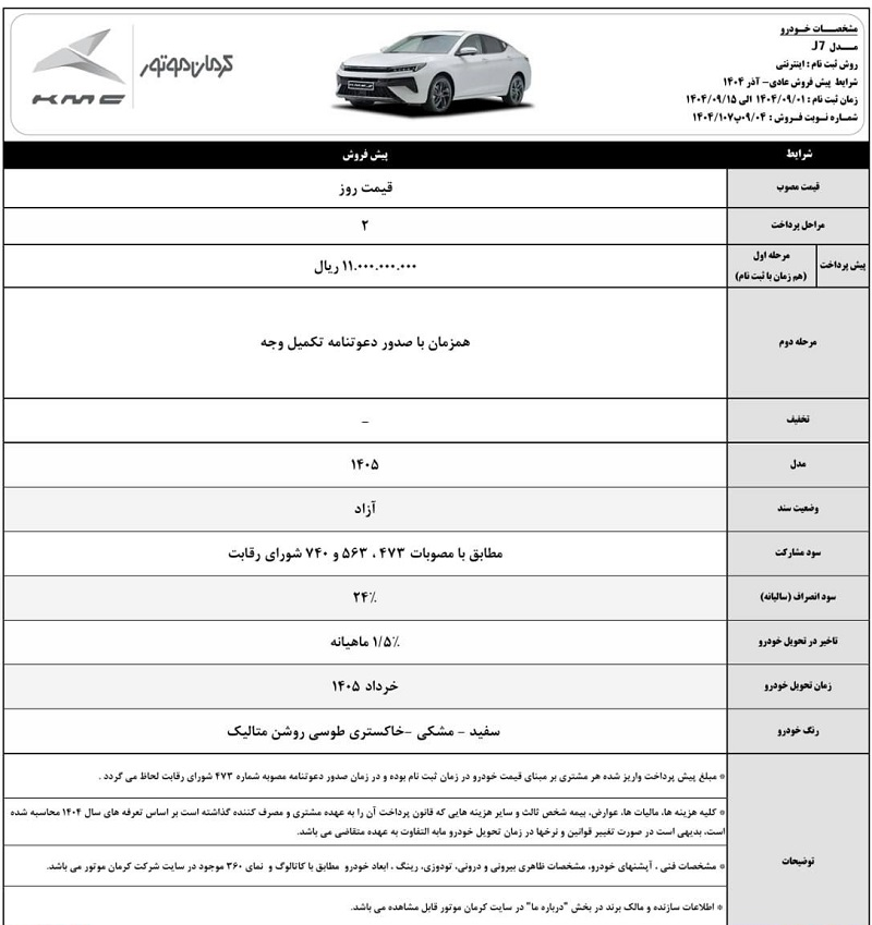 شرکت کرمان موتور با انتشار یک بخشنامه جدید، شرایط پیش فروش سدان کی ام سی J7 را برای آذرماه 1404 اعلام کرد. کلیه علاقهمندان به خرید این خودرو میتوانند از امروز یکم آذر تا 15 آذر، نسبت به ثبت نام و واریز وجه اقدام کنند.