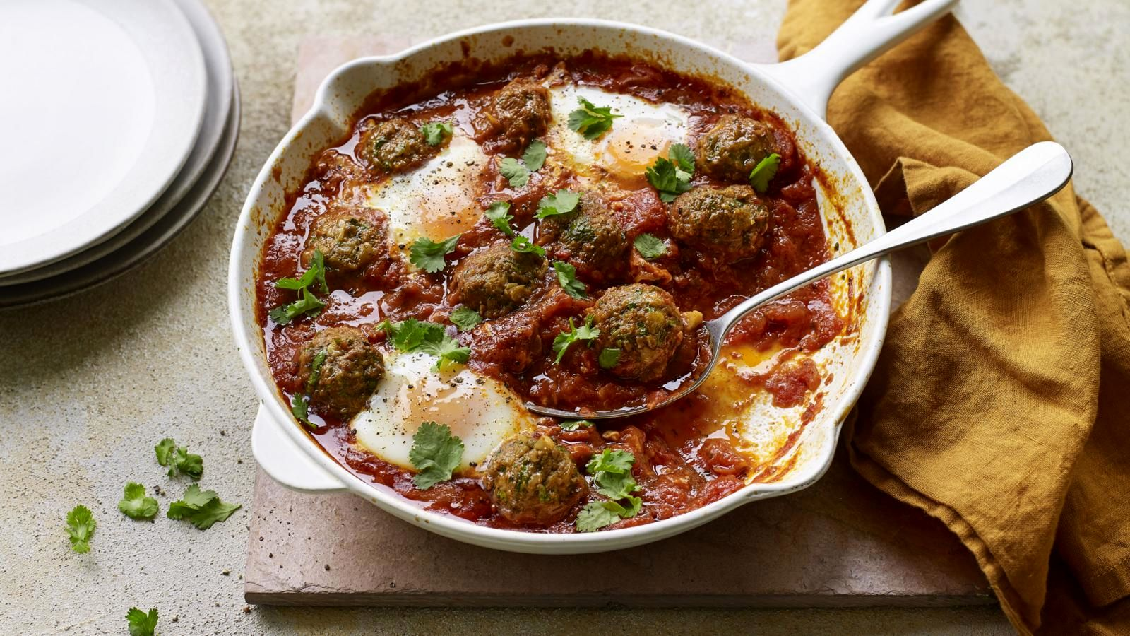 - با پشت قاشق در سس چند گودال کوچک ایجاد کنید و تخممرغها را یکییکی داخل گودالها بشکنید.