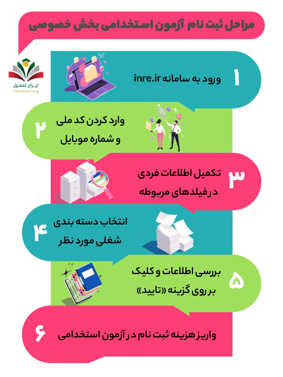 ثبت نام استخدام بخش خصوصی مسیر رسمی ورود متقاضیان به فرصت های شغلی شرکت های دانش بنیان، صنعتی و تجاری است که از طریق سامانه inre.ir انجام میشود. در این فرآیند، داوطلب باید پروفایل خود را تکمیل کرده، در آزمون شخصیت شناسی و شایستگی های شغلی شرکت کند و پس از پرداخت هزینه ثبت نام، مشاغل مورد نیاز سازمانها را انتخاب کند. سایت استخدام بخش خصوصی هر سال با انتشار دفترچه آزمون و اعلام زمان و مهلت ثبت نام آزمون استخدام بخش خصوصی، شرایط دقیق شرکت در آزمون را مشخص میکند.