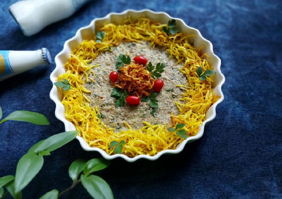 • سیب زمینی سرخ شده: سیب‌زمینی‌ها را به صورت مکعبی (نگینی) یا خلال‌های نازک خرد کرده و سرخ کنید تا برشته شوند. این سیب‌زمینی‌ها را برای تزئین نهایی کنار بگذارید.