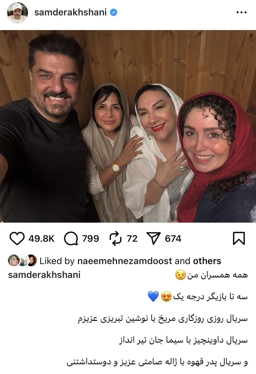 این بازیگر عکسی در کنار سه بازیگر زن سرشناس منتشر کرده و با یک شوخی هوشمندانه، به نقشهای مشترک خود در سریالهای تلویزیونی اشاره کرده است.