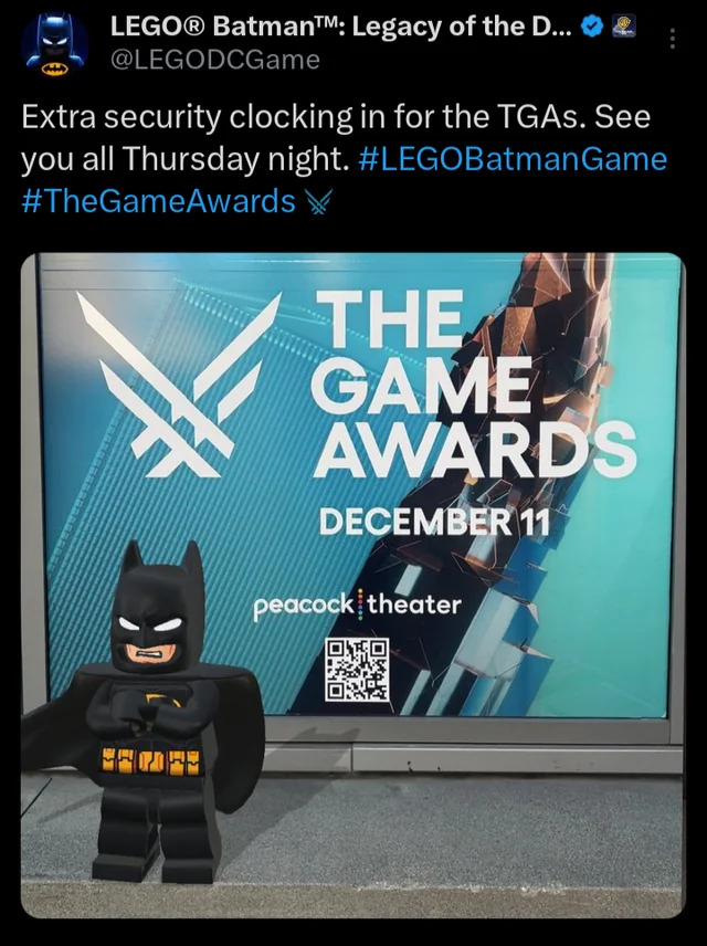 بازی LEGO Batman: Legacy of the Dark Knight به طور رسمی برای رویداد The Game Awards تایید شد و قرار است با تریلر جدیدی در این مراسم نمایش داده شود. تصویری از نسخه لگوی بتمن در مقابل سالن Peacock Theater در شبکههای اجتماعی منتشر شد که نشان میدهد امنیت بیشتری برای این رویداد در نظر گرفته شده است. این خبر علاقهمندان به این فرانچایز محبوب را هیجانزده کرده است.