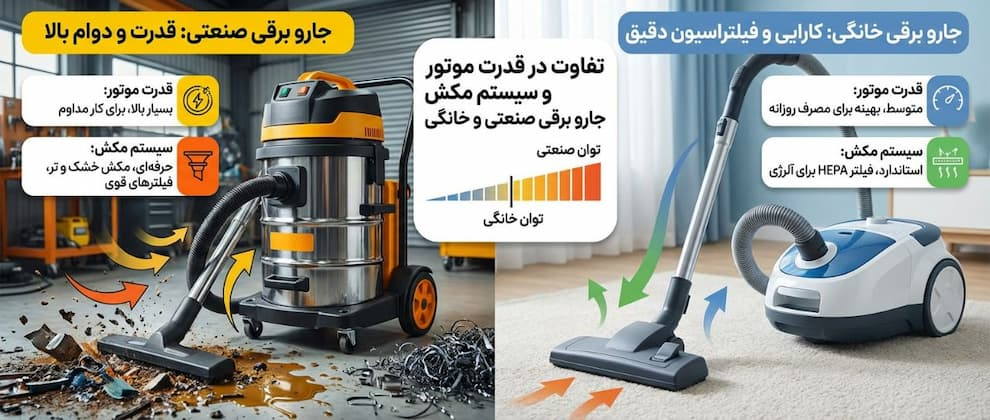 یکی از اصلی ترین تفاوت های جاروبرقی صنعتی و خانگی در توان موتور و قدرت مکش آن هاست.
