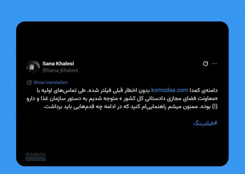 ثنا خالصی، بنیان‌گذار شبکه اجتماعی کمدا، در حساب کاربری خود در ایکس (توییتر سابق) اعلام کرد: «دامنه کمدا بدون هیچ اطلاع قبلی فیلتر شد. پس از تماس با معاونت فضای مجازی دادستانی کل کشور متوجه شدیم که سازمان غذا و دارو دستور این فیلترینگ را صادر کرده است.» وی همچنین از کاربران و فعالان خواست راهنمایی کنند چه اقداماتی باید انجام دهد.