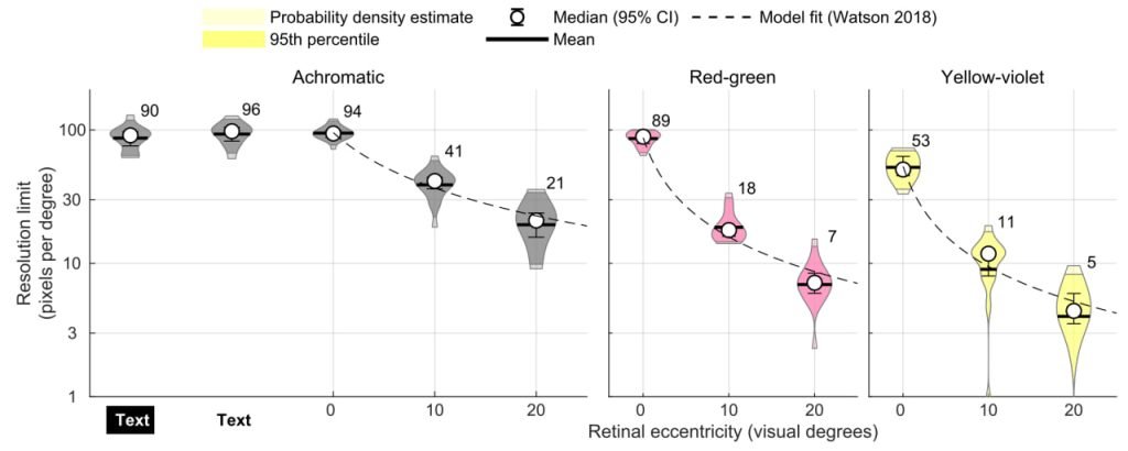 اشرف و همکارانش در مقاله خود که توسط مجله Nature Communications منتشر شده، نحوه تعیین حد وضوح چشم انسان را توضیح دادهاند و اشاره میکنند که هرچند دید 20/20 به این معنی است که چشم میتواند 60 پیکسلدرهردرجه (PPD) تشخیص دهد، بیشتر افرادی که بینایی عادی یا اصلاحشده دارند میتوانند بهتر از این مقدار ببینند.